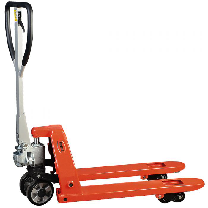 Schmal und wendig, optimal der neuen Flachpalettengeneration angepasst, debütiert dieser robuste Gabelhubwagen. Ob Euro 1, Euro 3, Euro 6 oder 1/4 Flachpalette – alles verfahrbar mit nur einem Gabelhubwagen. Mit einer Gesamttraglast von 1,5 t und einer Außenbreite von nur 420 mm zeigt sich das Modell Premium Euro 6 als gelungenes Gesamtkonzept, das in Ihrer Logistik nicht fehlen darf.